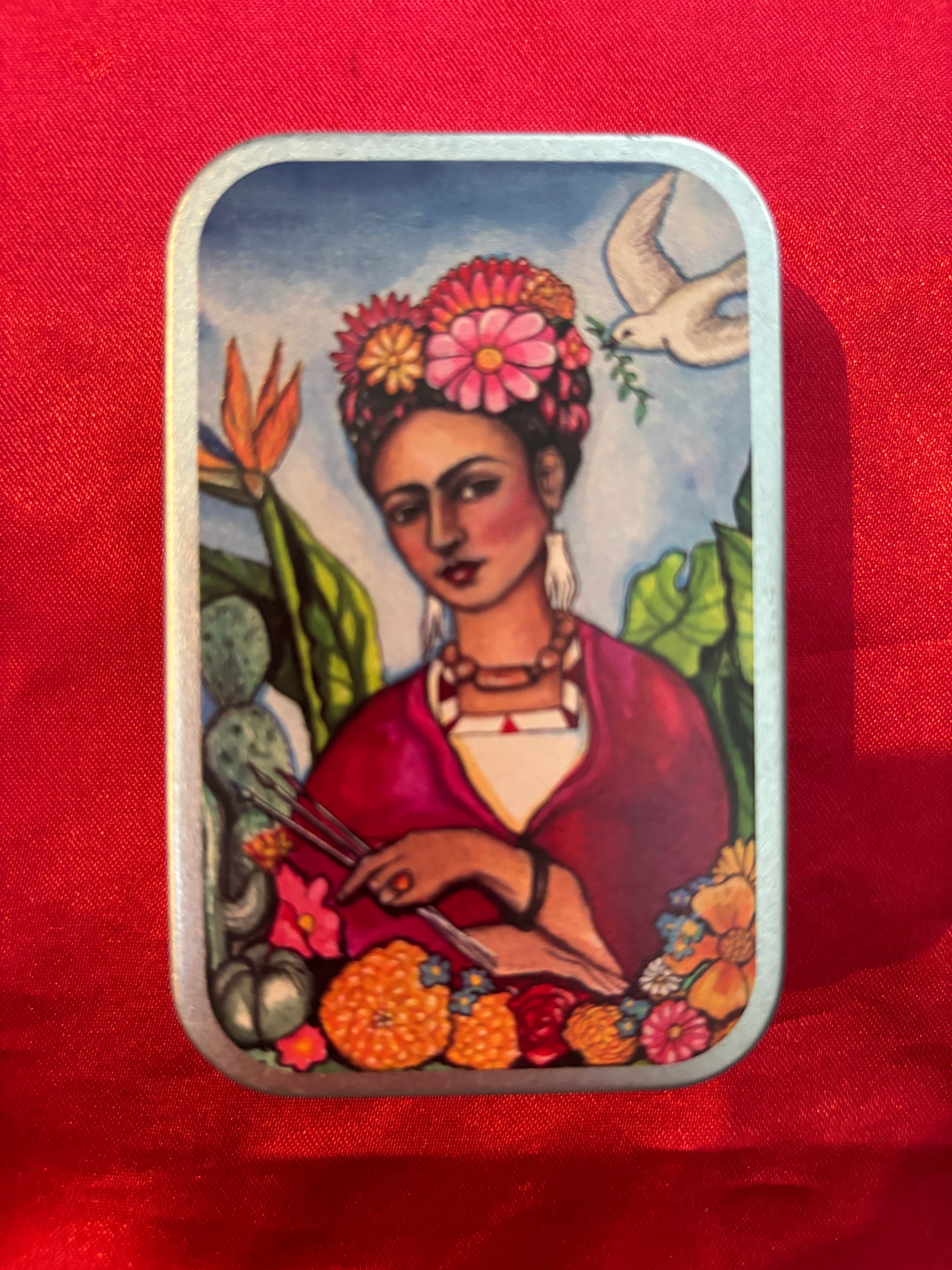 Features Friday Kahlo holding her brushes after painting one of her masterpieces