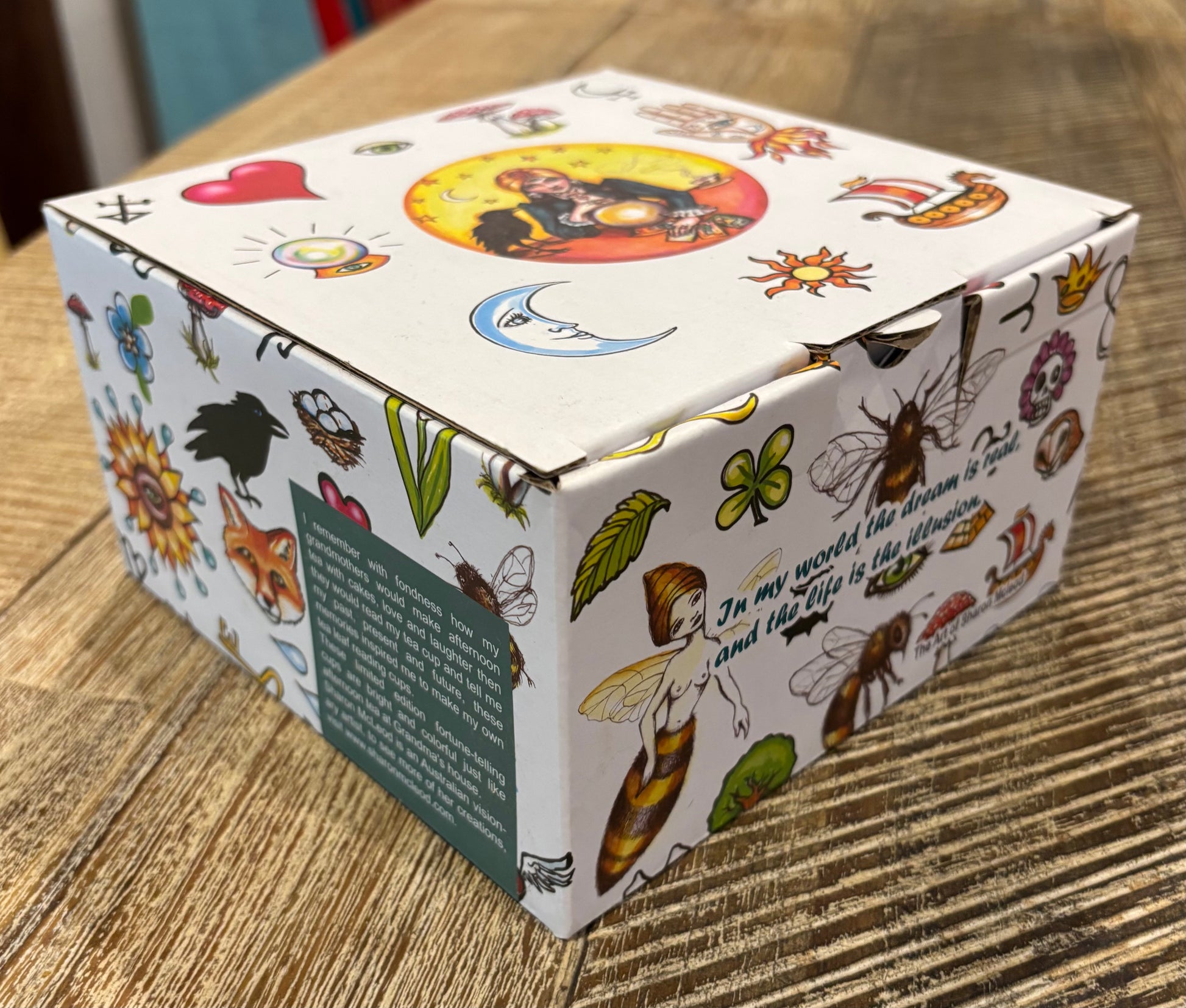 This beautiful fortune telling cup and saucers is part of Sharon’s range of divination cups and saucers. Designed by Sharon and shows her love of symbols and all things divine and magical. This image is from the Oracle of the Innocent Heart that Sharon Illustrated.
