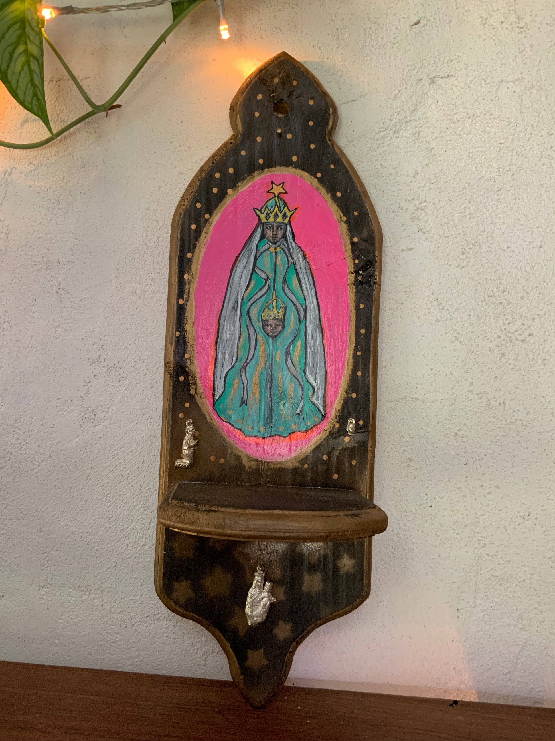 This gorgeous hand made altar /shrine is made from 70 year old recycled hoop pine .This is a one off piece, hand painted and charms hammered on by Sharon herself.