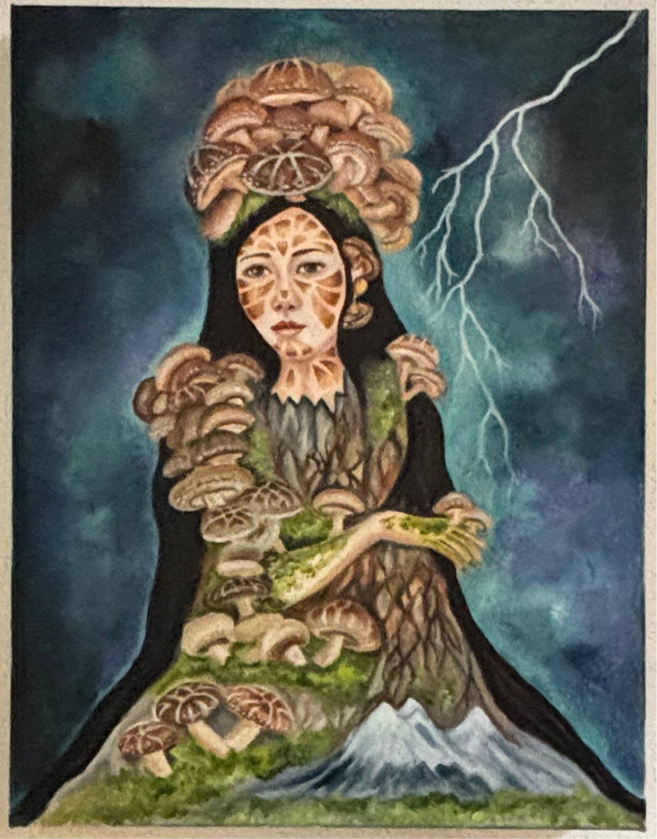 The storm brings new growth. Embrace its flashes of energy and sustenance and put what you have learned into practice. The Shiitake Fae sits like a statue, tall and true, even when heavy rain, thunder and lightning cause chaos all around her. Likewise, the next storm will wash over you like a welcome shower. There is more than sunshine to come. Look out for rainbows, and maybe even a pot of gold.[gold frame not included ]